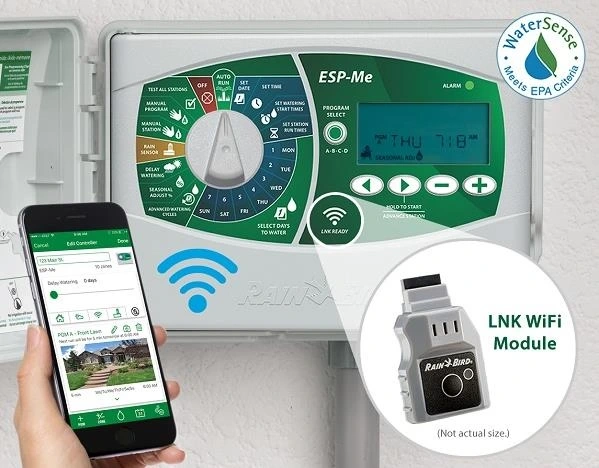 LNK WiFi Modülü, kullanıcıların bir Rain Bird ESP-Me'ye veya ESP-RZXe Sulama Kontrol Ünitesine takılabilir aksesuarla ve İnternet erişimi bulunan Apple iOS ya da Android uyumlu mobil cihazlar kullanarak uzaktan erişmesini sağlar.