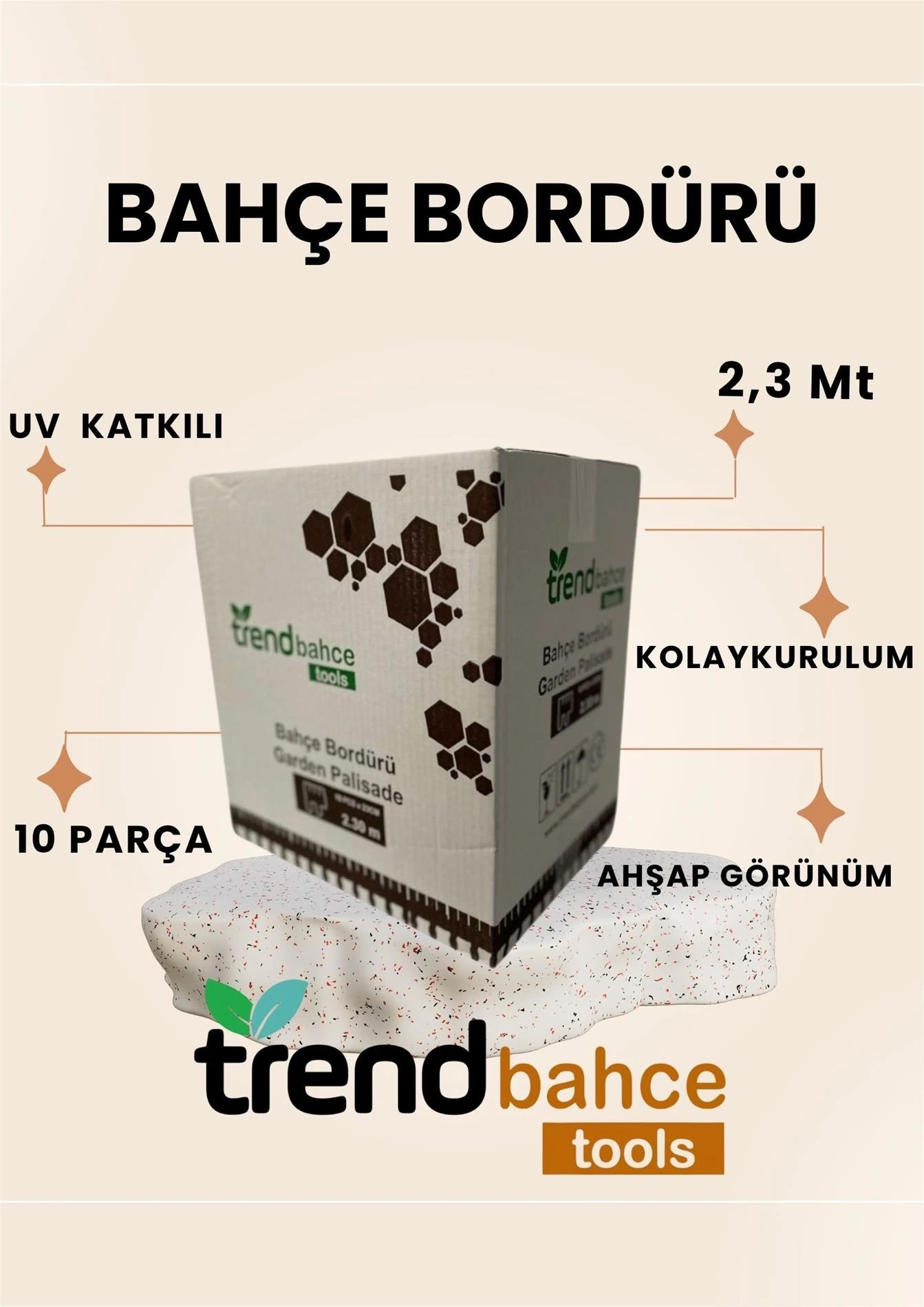 Çim ekili alanları bitki yataklarından ayırmak için tasarlanmıştır. Aynı zamanda yürüyüş yolları, bina kenarları, çiçek parterleri gibi bir çok alanda ayırma bordürü olarak kullanılabilir. Esnek yapısı sayesinde hem düz hem de farklı şekiller yapmanıza olanak sağlar. Ürün yüzeyinde doğal ahşap doku deseni bulunmaktadır. Tabandaki kazık sistemi sayesinde ek ürün gerektirmeden kolayca uygulayabilirsiniz. Uv ışınlarına, aşırı sıcak ve soğuk havalara dayanıklıdır. Koli içerisinde ahşap görünümlü 2.3 metre bordür bulunmaktadır.